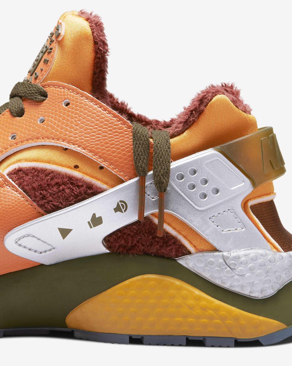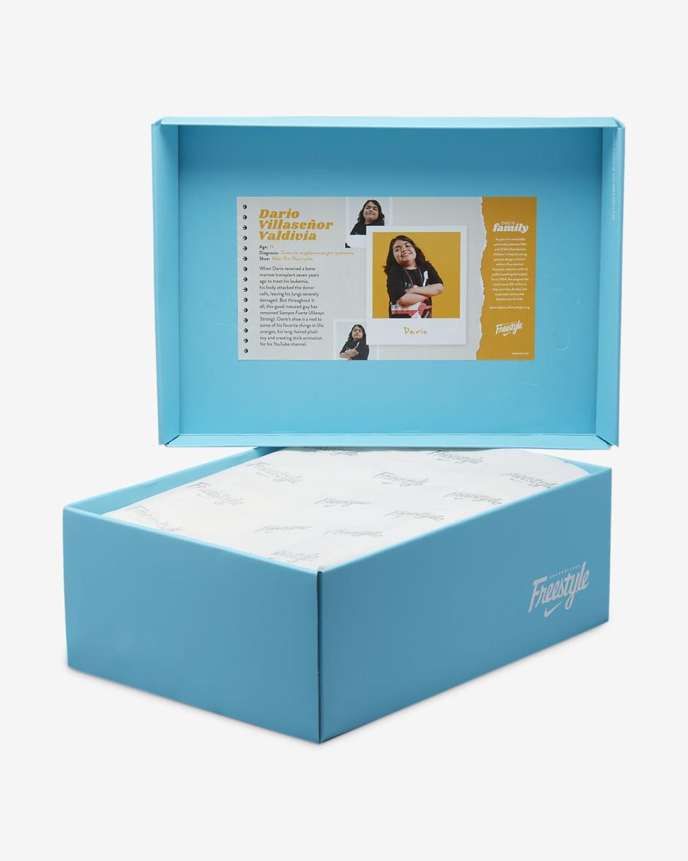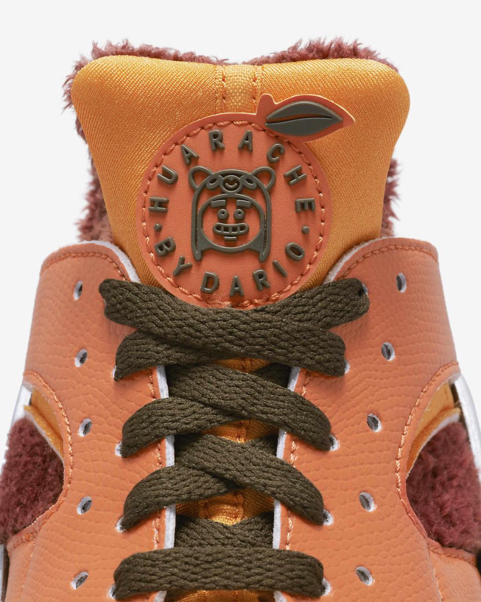 Dario Villaseñor Valdivia may only be 14, but his medical team describes him as an old soul with wisdom beyond his years. Dario’s journey has certainly been a challenging one—when he received a bone marrow transplant 7 years ago to treat his leukemia, his body attacked the donor cells, resulting in severe chronic lung disease. No matter how Dario is feeling or what he’s dealing with, he always has a smile and a “How are you doing today?” for everyone he meets. His vibrant personality is evident throughout his Air Huarache, which arrives in bright orange inspired by his favorite fruit. A furry collar nods to a plush toy gifted by his sister after a long hospital stay, while stick figures on the toe box represents Dario’s passion for animation—which he plans to do professionally someday.