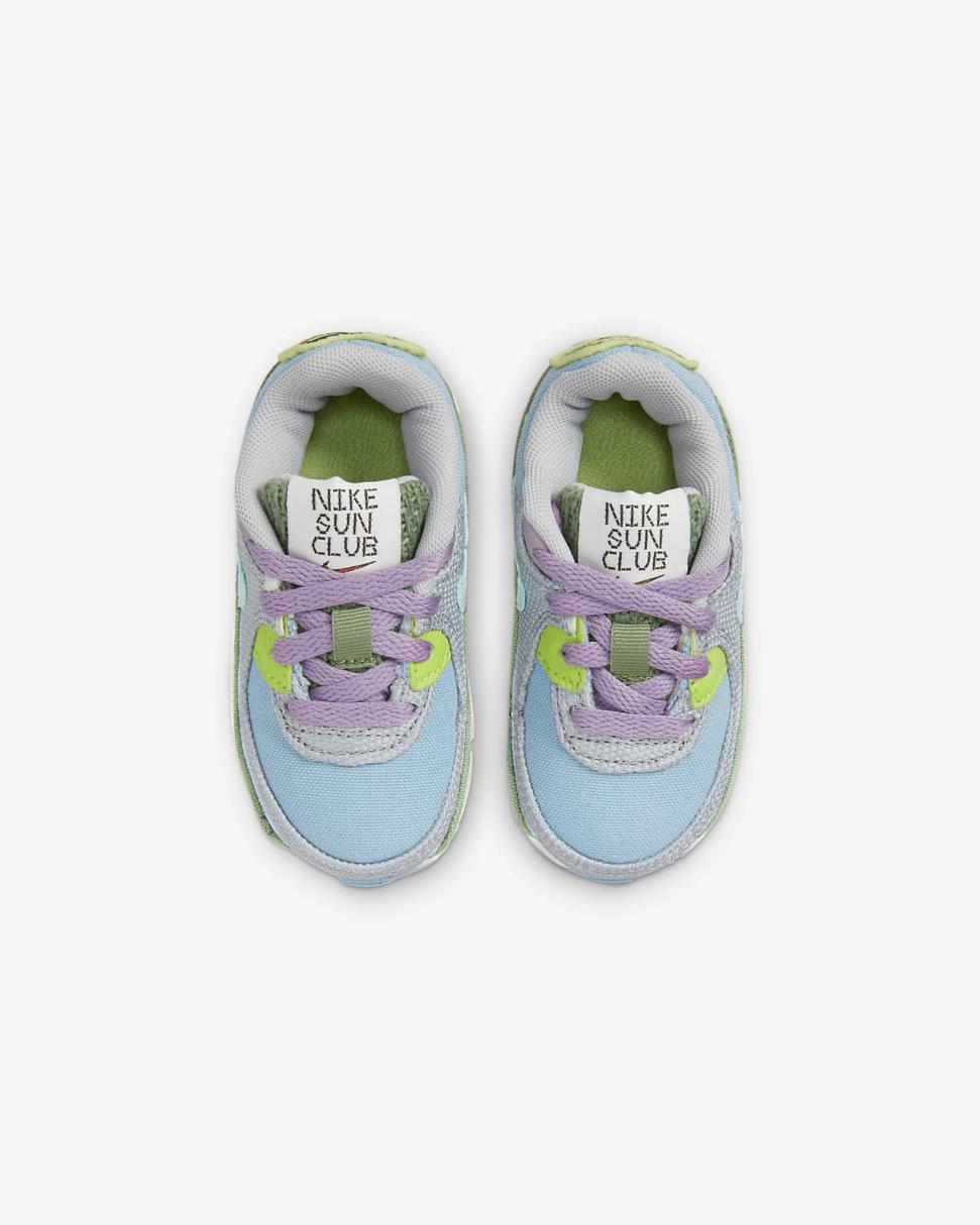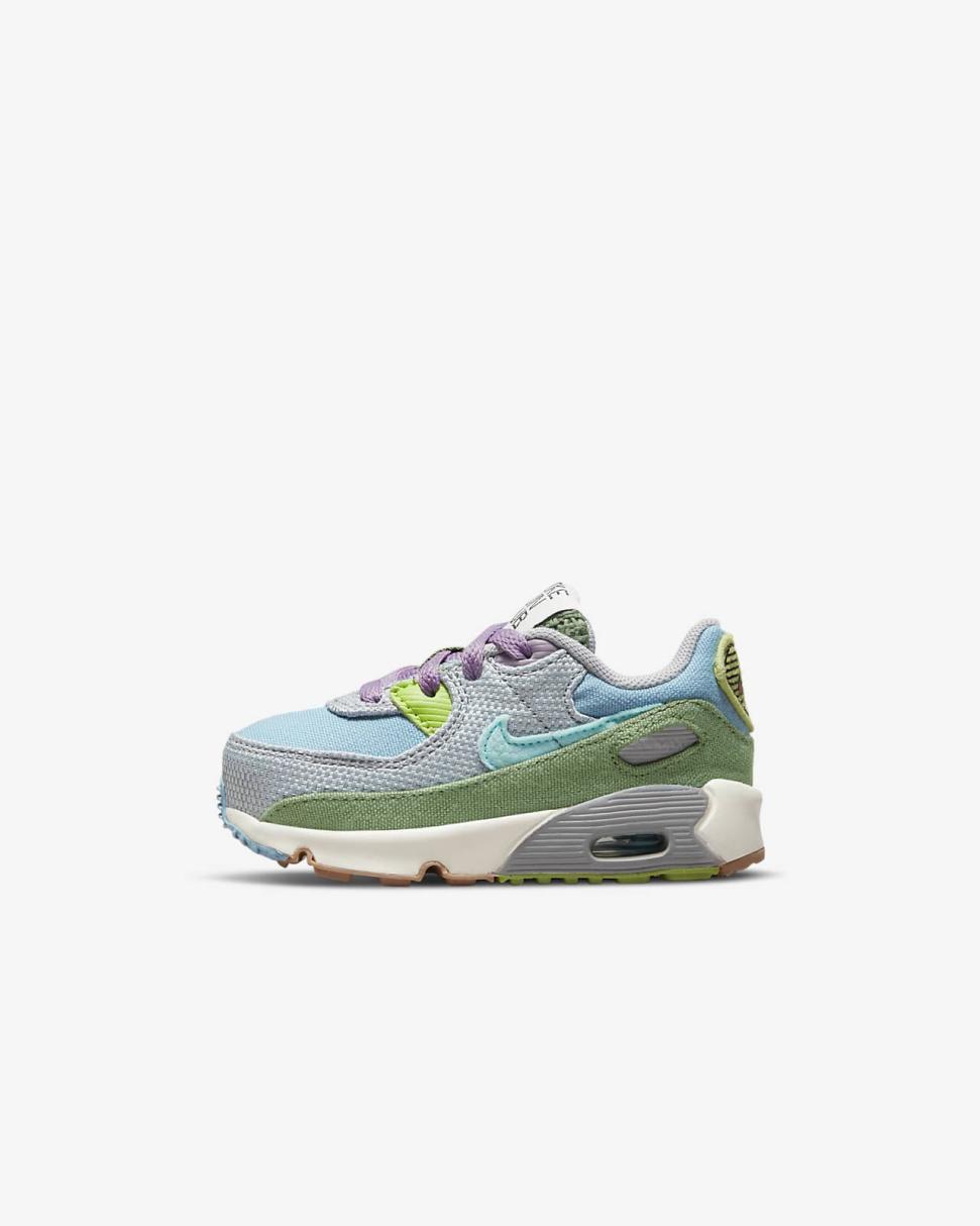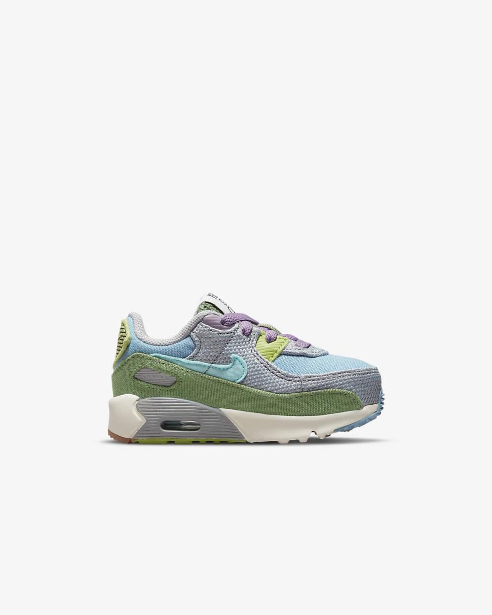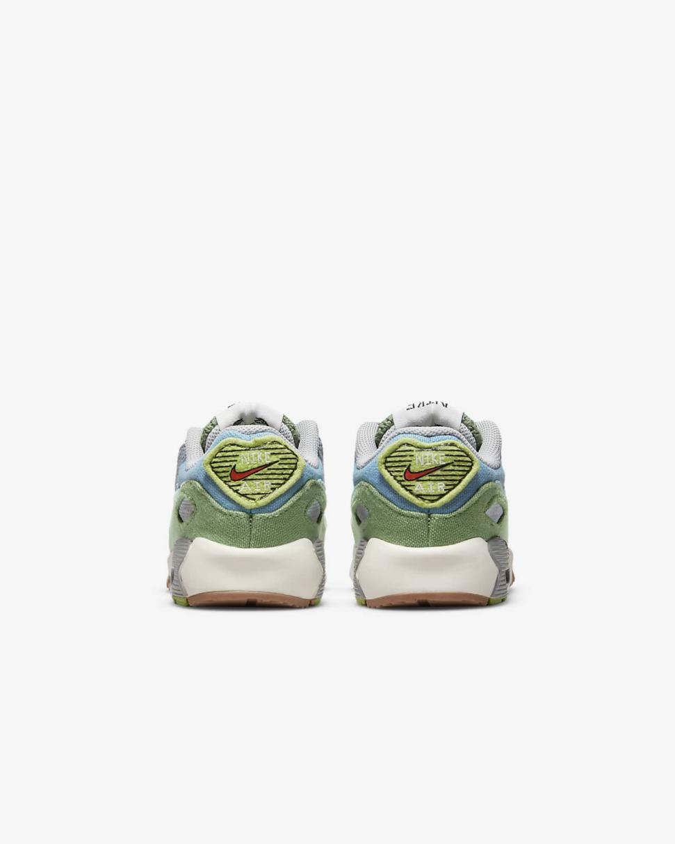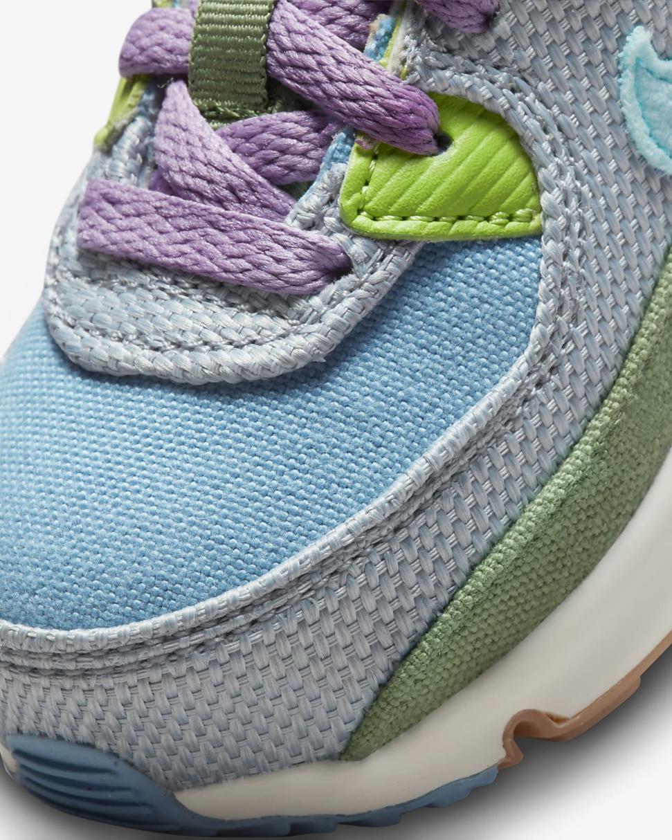 Fun details and fresh colors bring beach vacation vibes to the Nike Air Max 90 SE Next Nature. Summertime fabrics keep little feet cool, while the classic style continues with a Waffle sole, durable accents and visible Air.