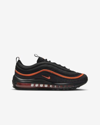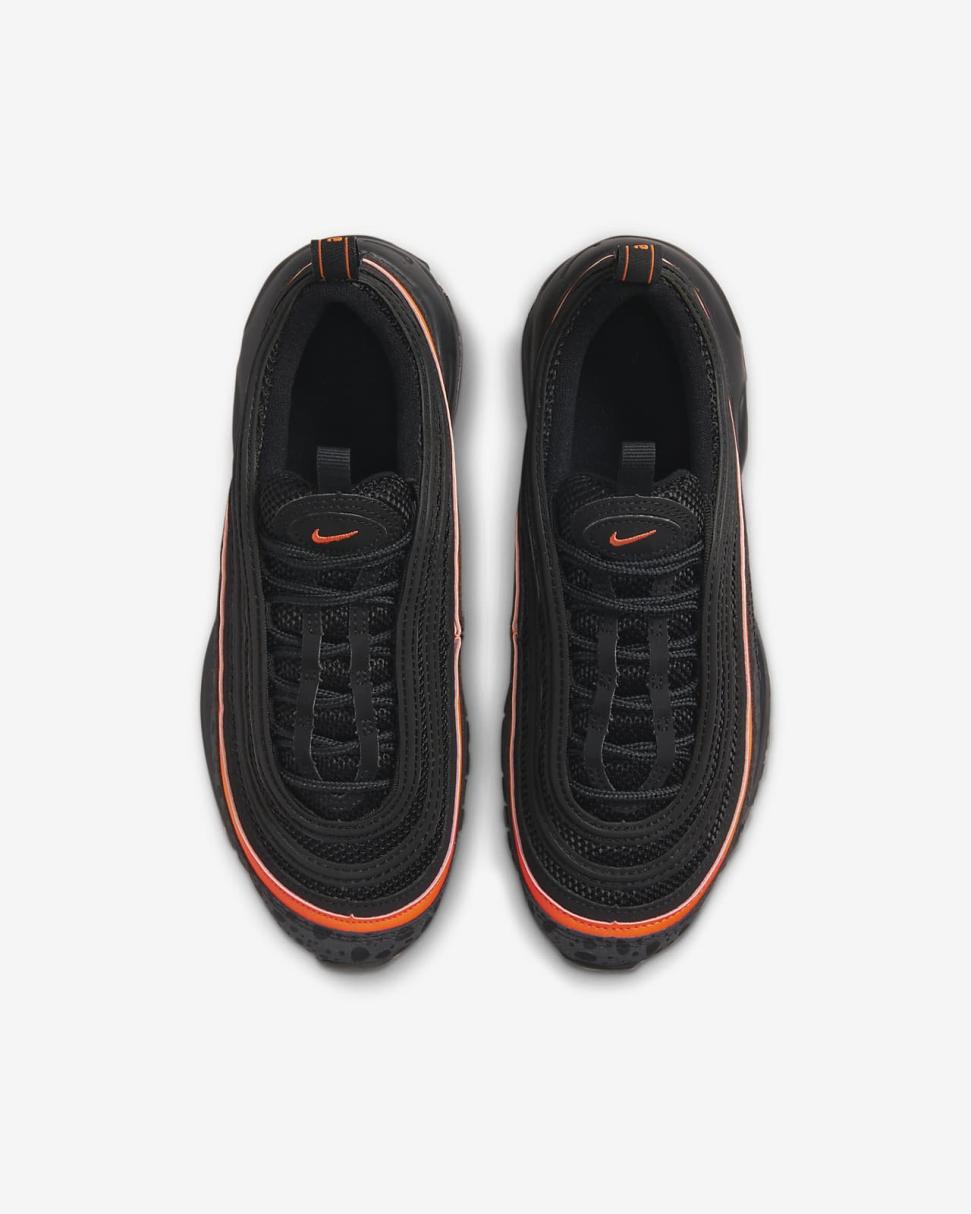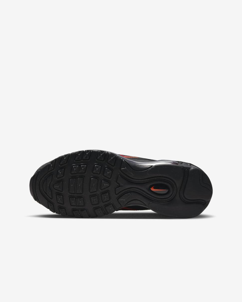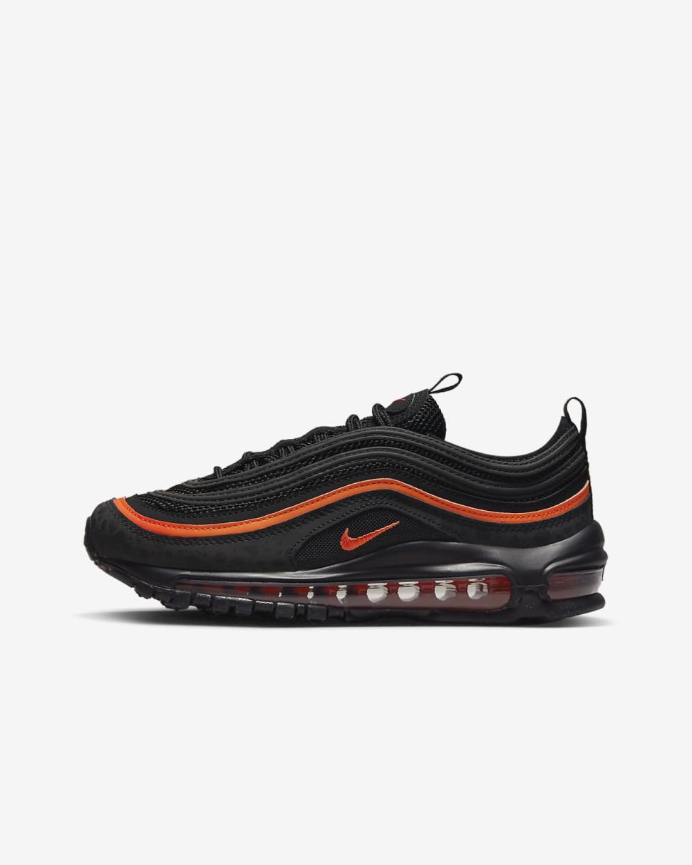 Go full speed at playtime with the Nike Air Max 97. Its iconic rippled upper takes inspiration from Japanese bullet trains and features synthetic leather for durability and reflective details for fast-paced style. Full-length Max Air cushioning will have you feeling like you’re walking on air.