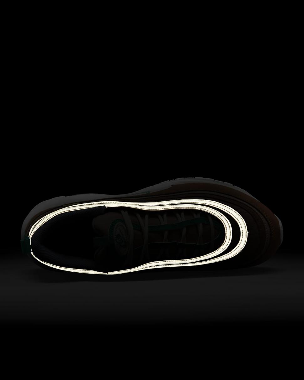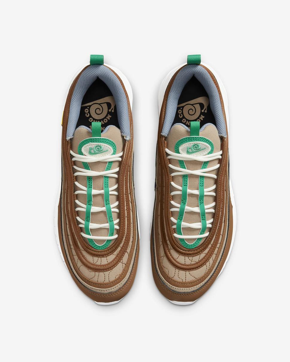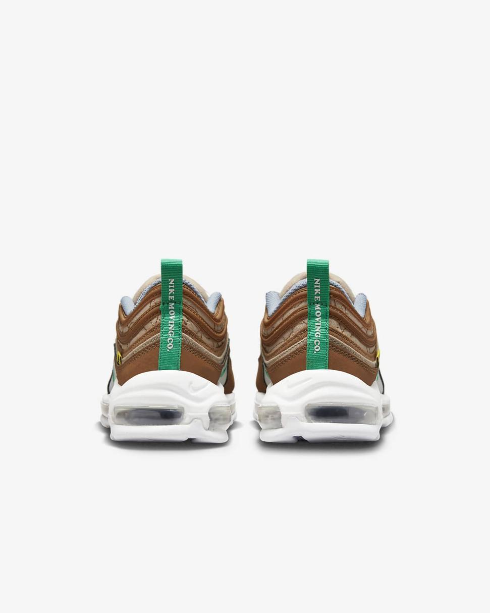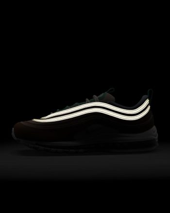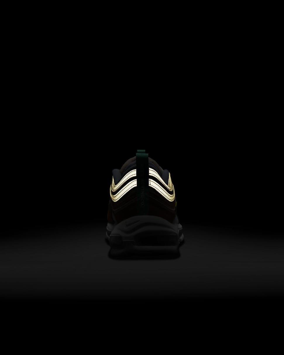 Find out what moves you in the Nike Air Max 97. Our iconic design, originally inspired by Japanese bullet trains, now tells a playful story rooted to our history of moving people. The textile upper, hemp accents and snail-trail stitching nod to our fictional "NIKE MOVING CO." And to top it off on the bottom, visible Nike Air cushioning lets you ride in first-class comfort. So, where next?