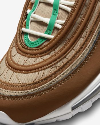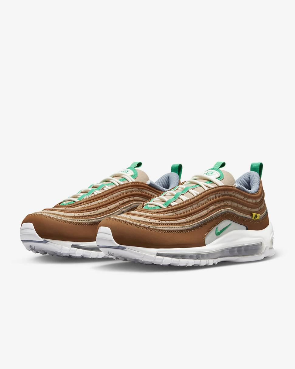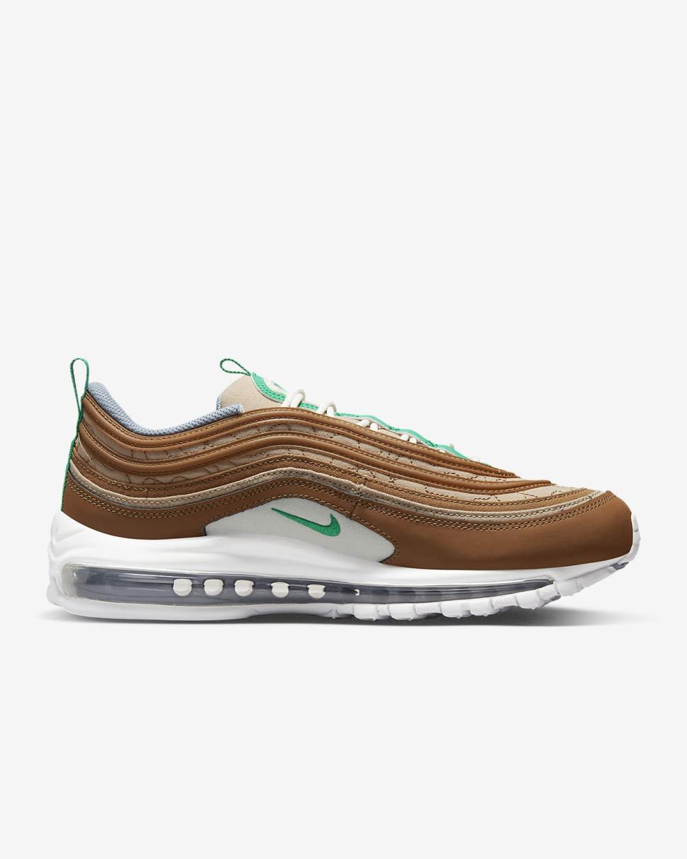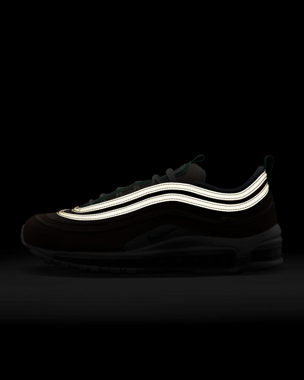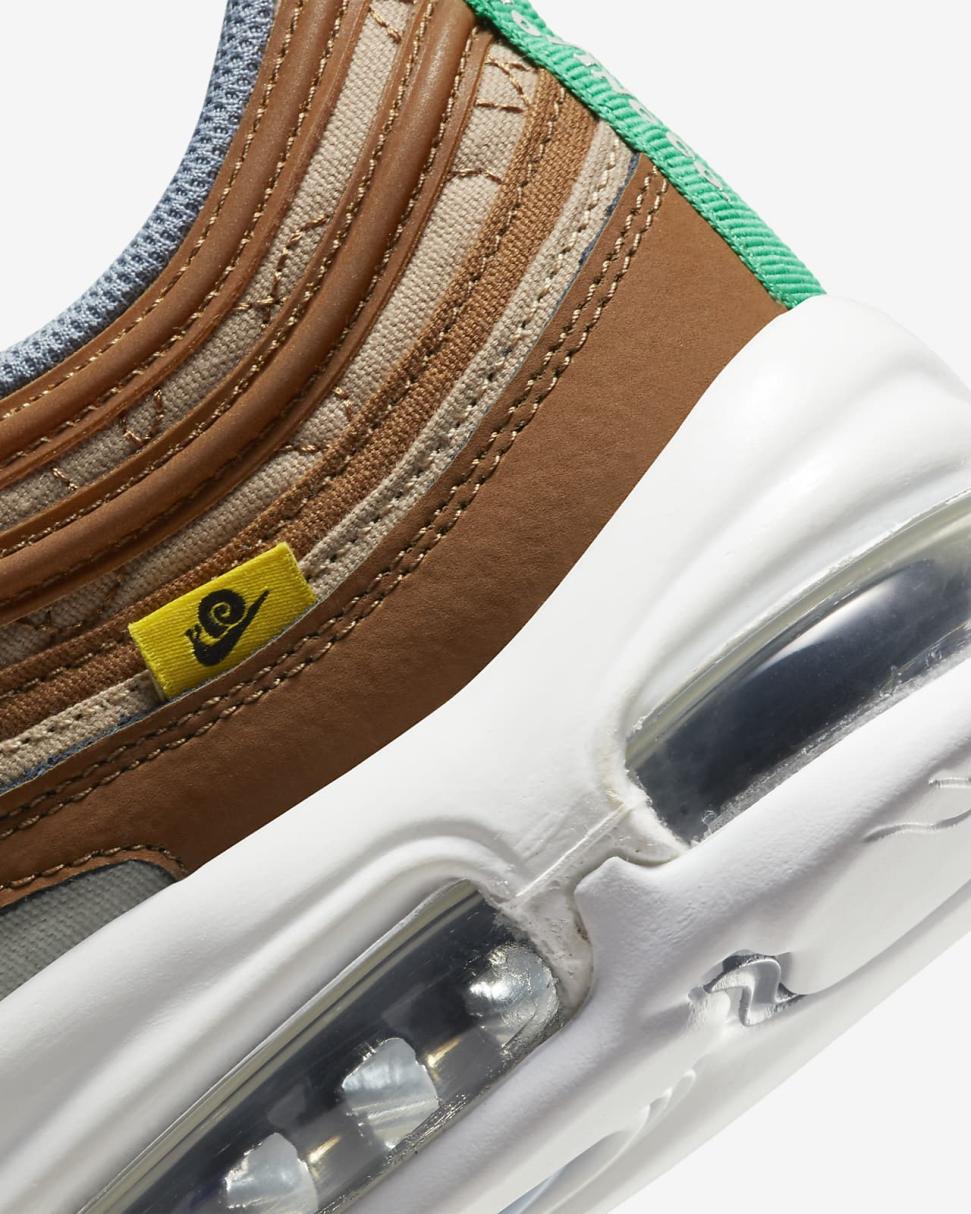 Find out what moves you in the Nike Air Max 97. Our iconic design, originally inspired by Japanese bullet trains, now tells a playful story rooted to our history of moving people. The textile upper, hemp accents and snail-trail stitching nod to our fictional "NIKE MOVING CO." And to top it off on the bottom, visible Nike Air cushioning lets you ride in first-class comfort. So, where next?