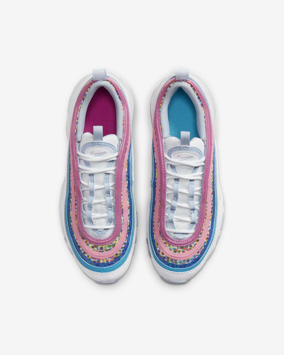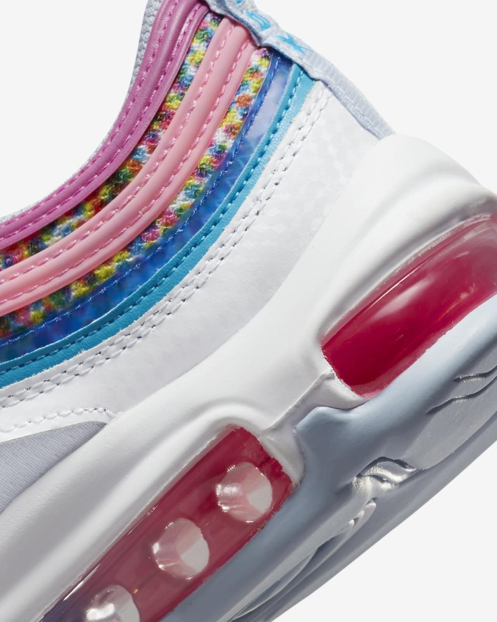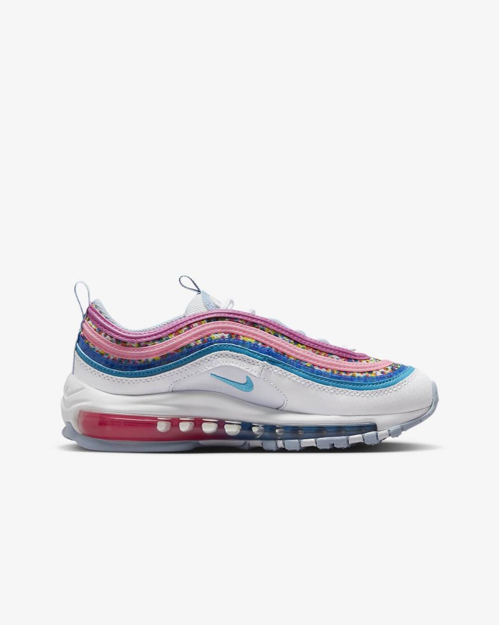 The easiest way for kids to express themselves? Bright colors! Bring that joy to your next pair of kicks with the Air Max 97. The design and feel are just like the original 97 with durable synthetic and real leather and a full-length Air unit.