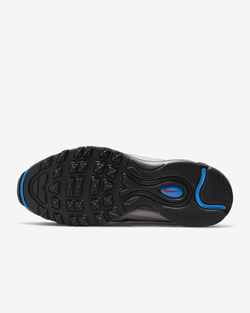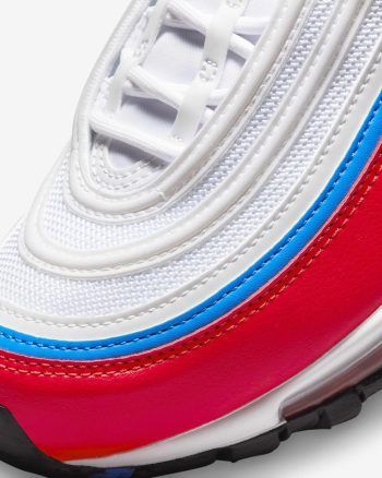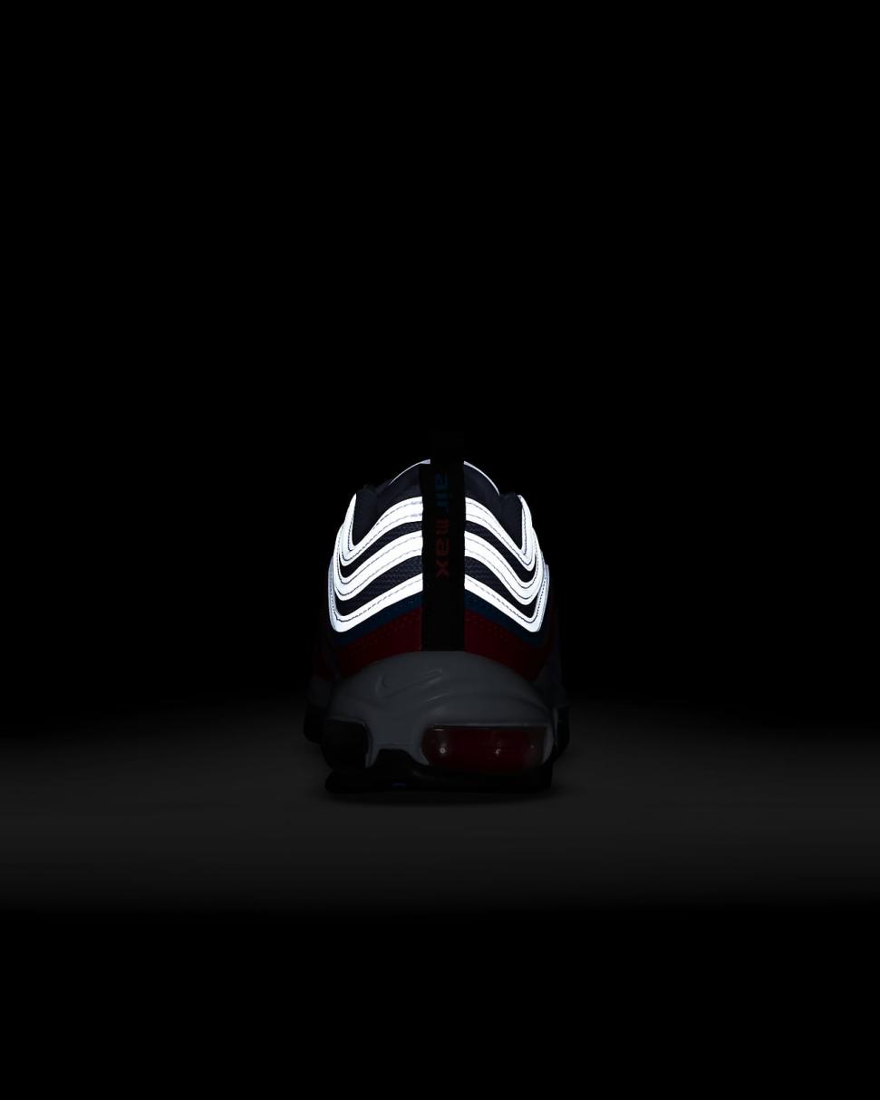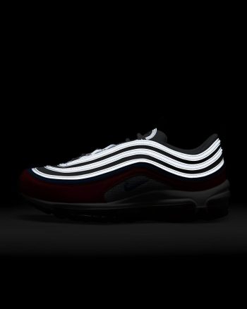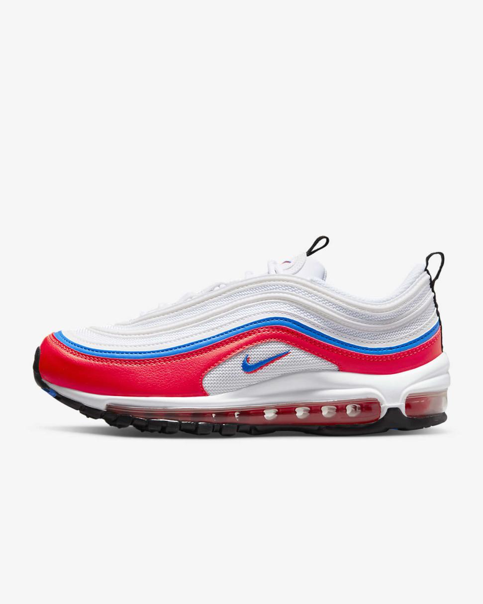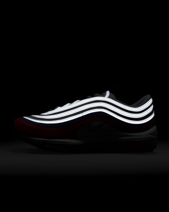 Push your style full speed ahead in the Nike Air Max 97, which features an iconic ripple design inspired by Japanese bullet trains. Pops of red, white and blue add a fresh update, while the revolutionary full-length Nike Air unit that once shook up the running world lets you ride in first-class comfort wherever you go.
