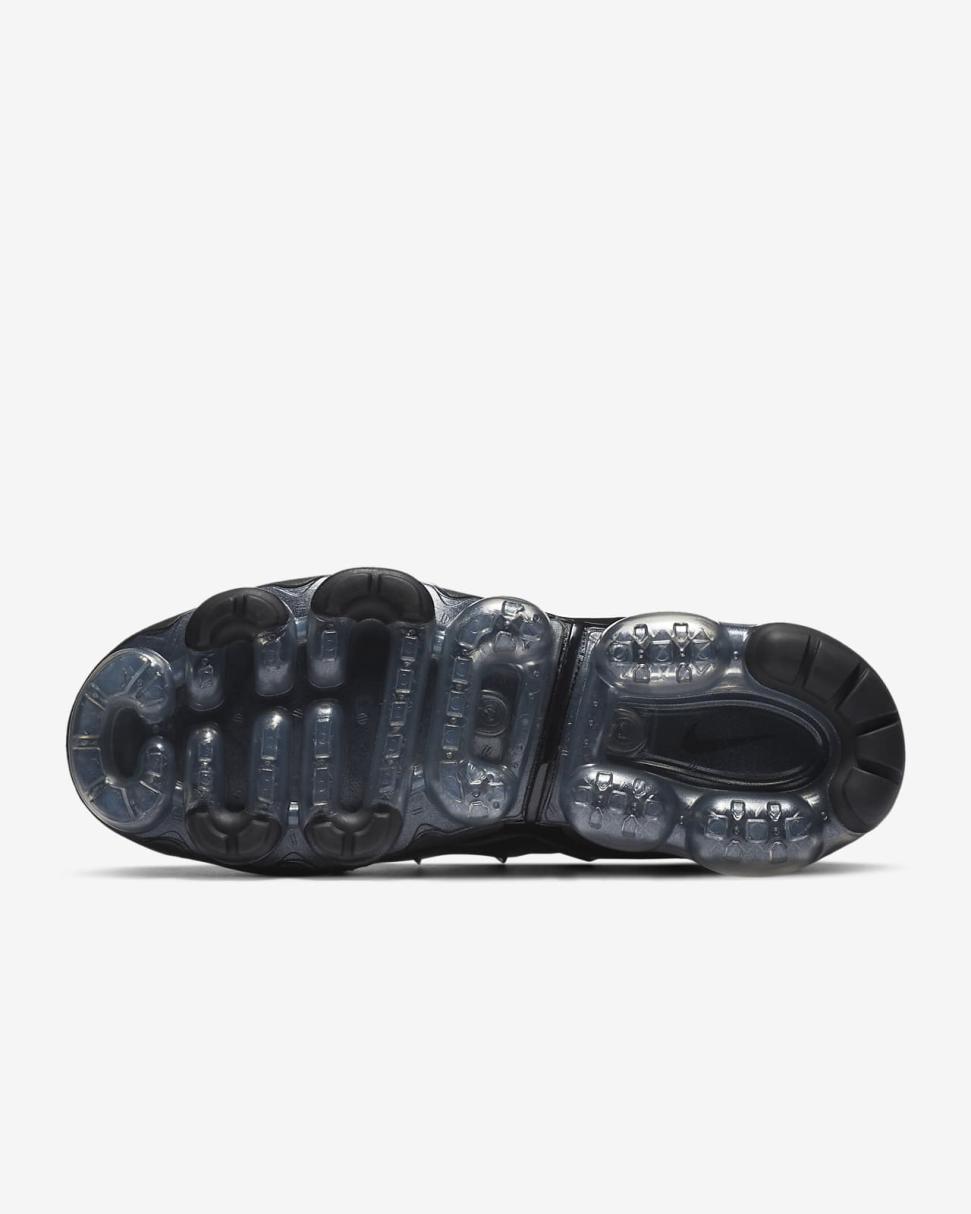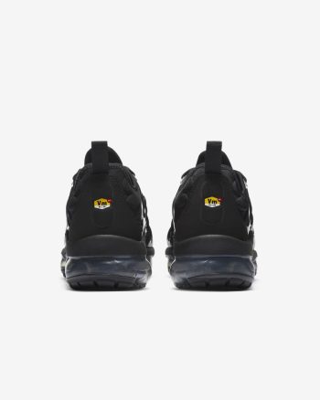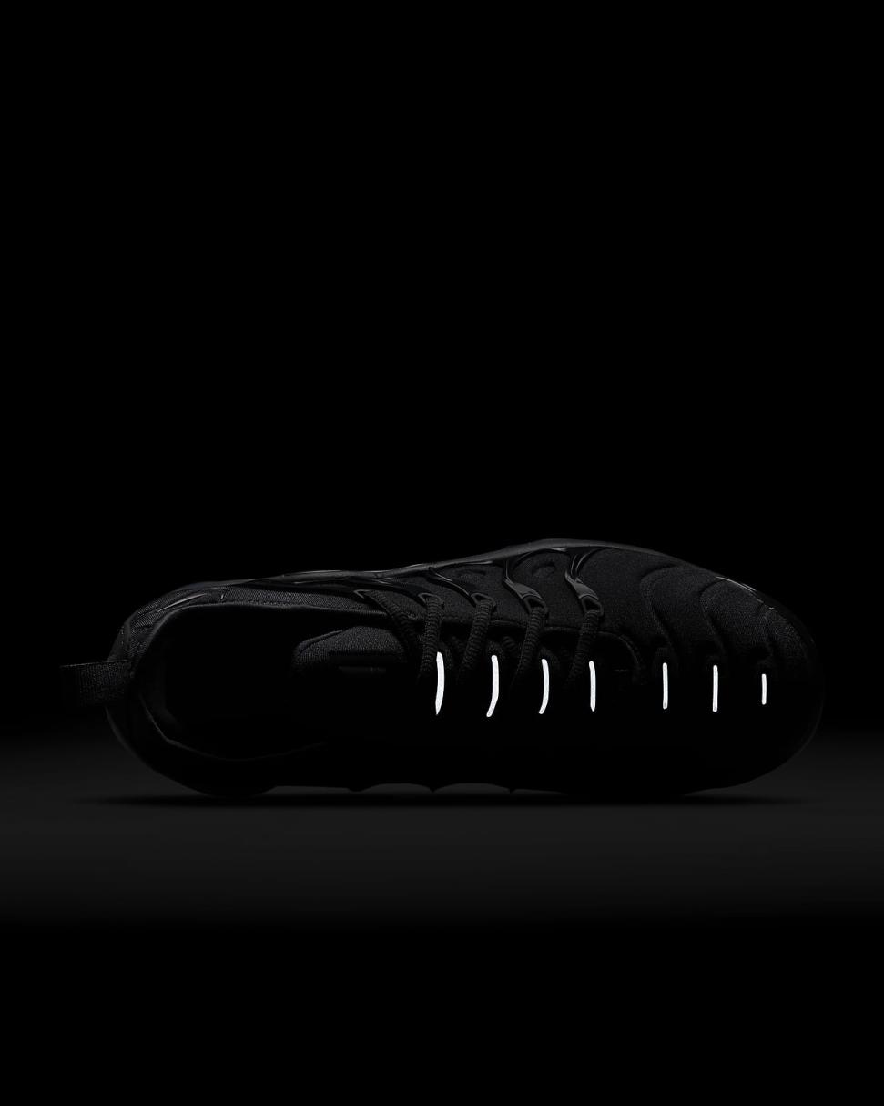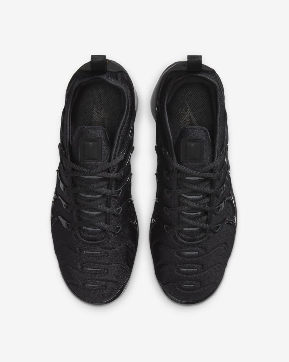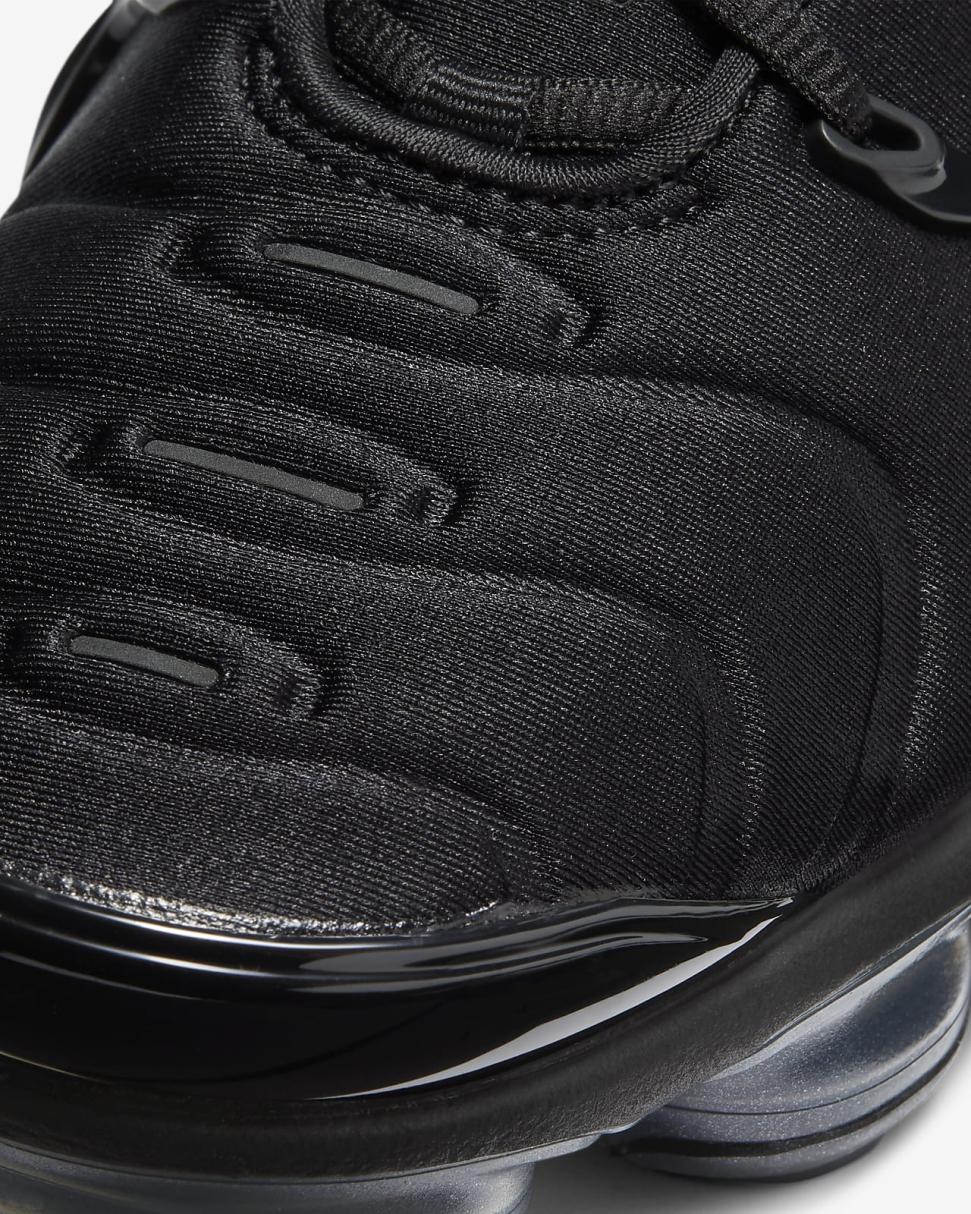 The Nike Air VaporMax Plus looks to the past and propels you into the future. Made with at least 20% recycled material by weight, it keeps the future in mind while including design elements from the '98 Air Max Plus. Revolutionary VaporMax Air technology provides comfort and a modern look, while the floating cage, heel logo and iconic whale tail midfoot shank add heritage style. A sleek all-black upper and black rubber pods on the outsole show off your dark side.