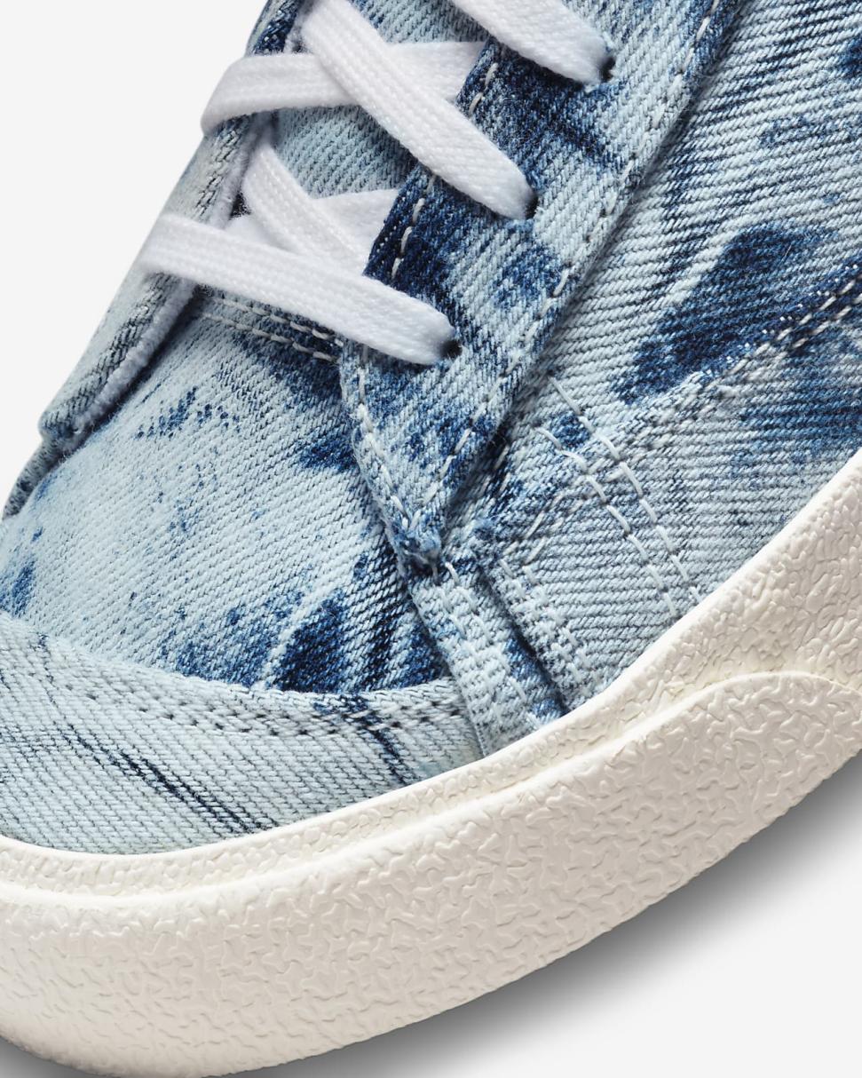 Styled for the ‘70s. Loved in the ‘80s. Classic in the ‘90s. Ready for the future. The Nike Blazer Mid ’77 delivers a timeless old-school basketball design in an easy-to-wear style. Bleached denim adds a touch of Americana to this throwback classic. Exposed foam on the tongue and a special midsole finish make it look like you’ve just pulled them from the history books.