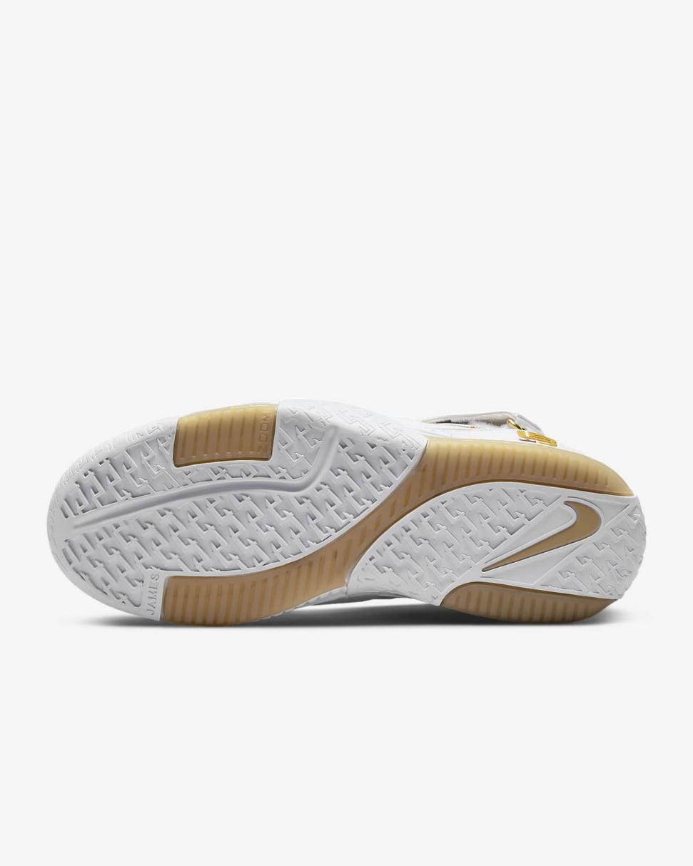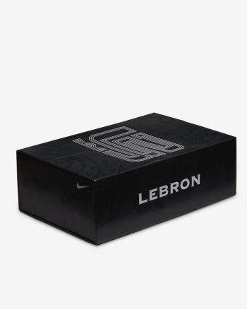 A first for Nike Basketball, the laser-etched graphic under the strap pairs with a repeating "LJ" pattern on the outsole for a premium off-court look.
