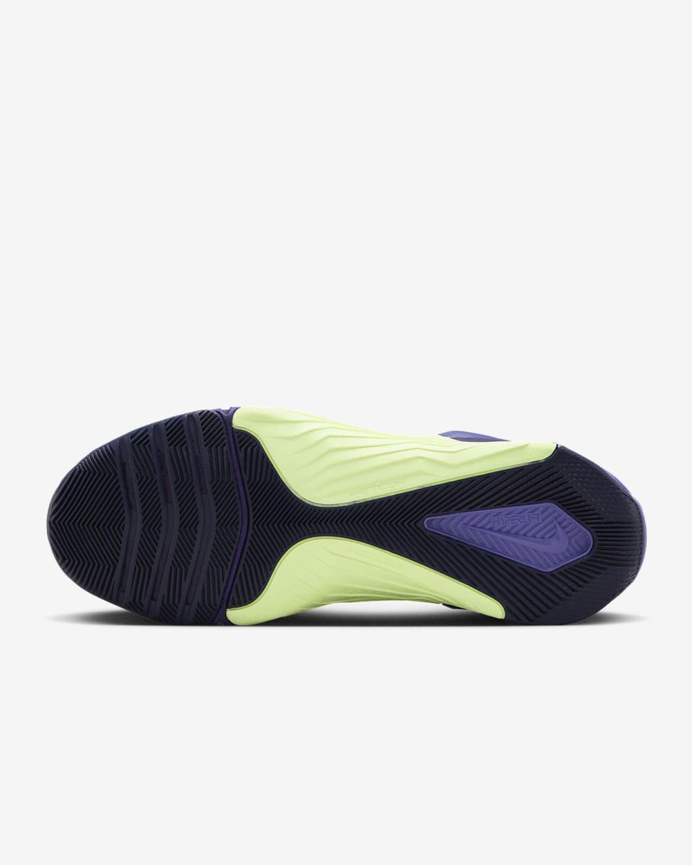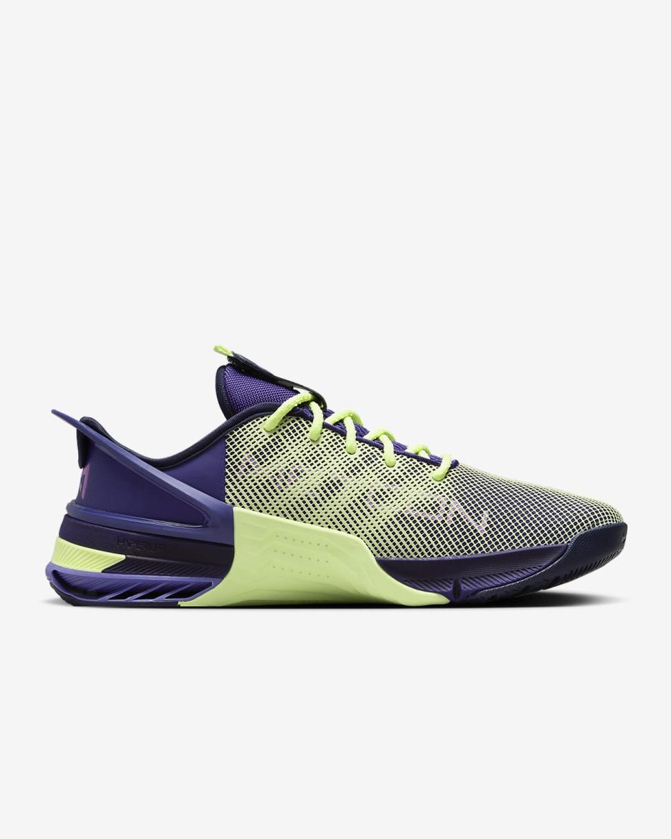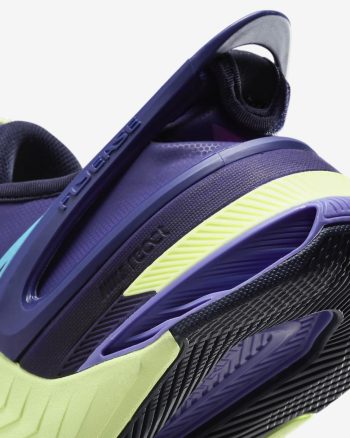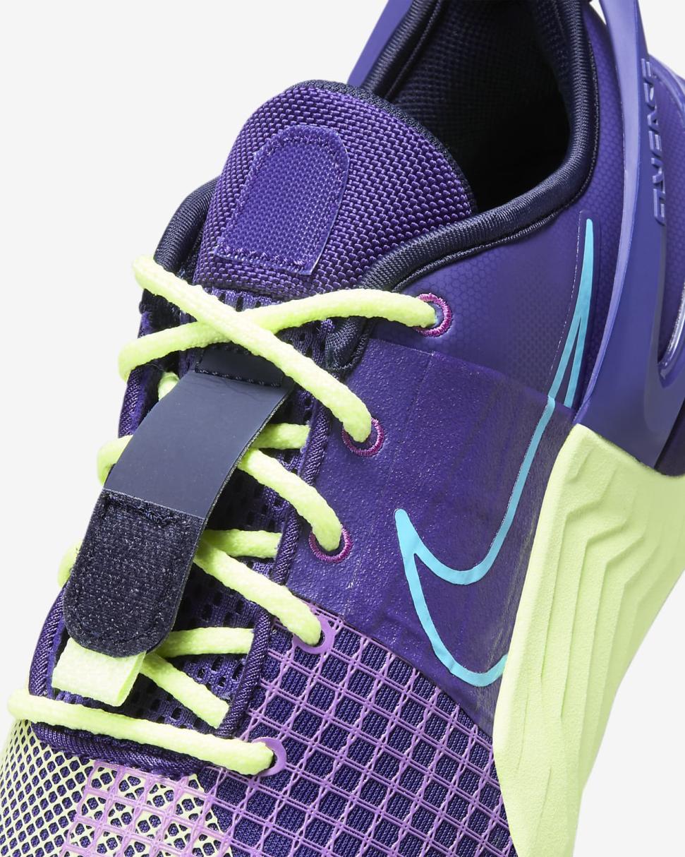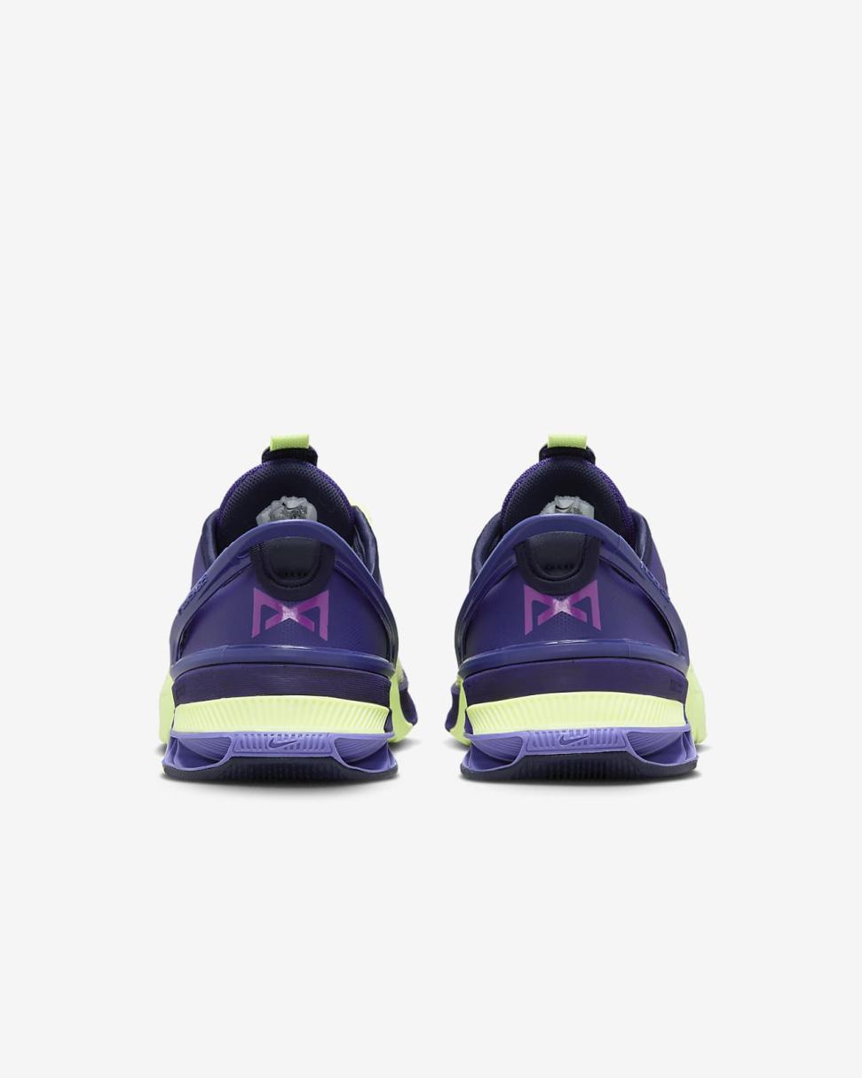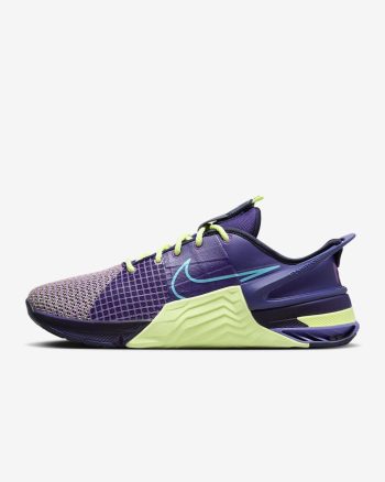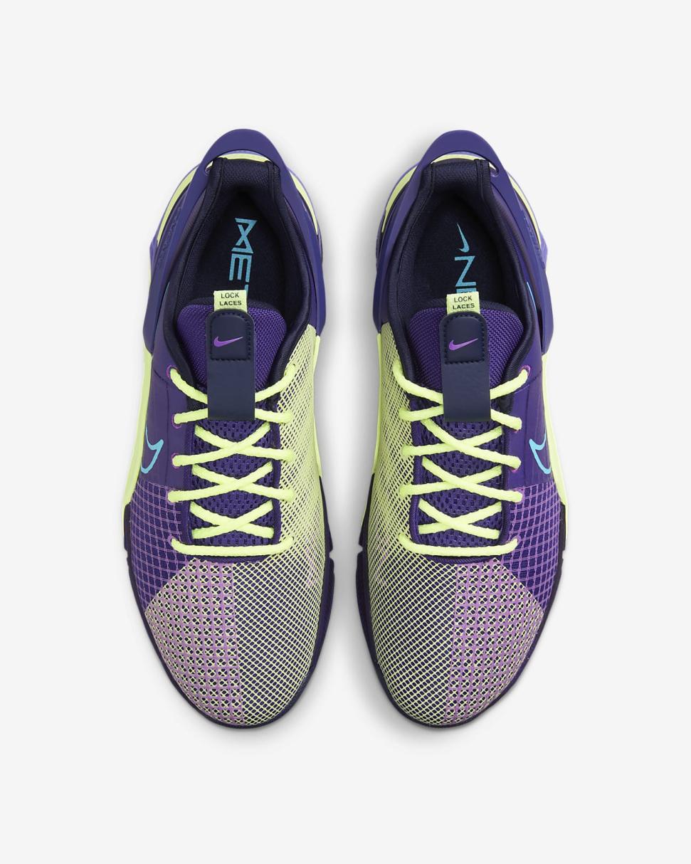 Turn your workout into a party in this special Nike Metcon 8 AMP. Pulsating purples and vibrating neon yellows are fit for pumping your fist to the beat between sets or using that electric pairing as inspiration to find 1 more rep. The upper is lighter and more breathable than our previous edition to complement our standards of durability and comfort, so that you can float through your cardio and power through your lifts. This version has a collapsible heel that lets you step in without using your hands, then it snaps back up to secure your foot.