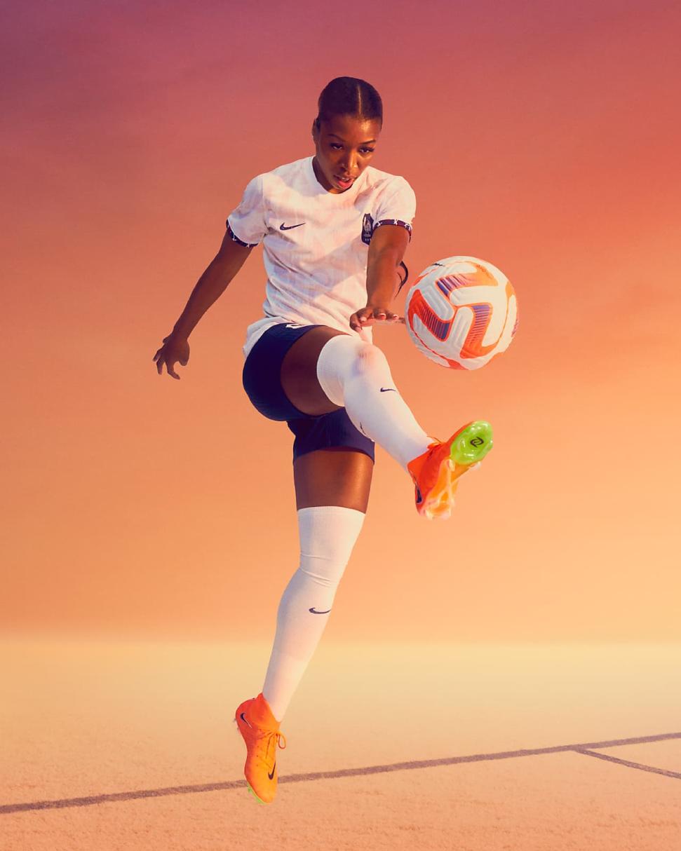 Step into the dawn of a new day and put the globe on notice about your skills. A flashy iridescent plate, futuristic graphic and vibrant colors resembling a gradient sunrise speak to the gravitational power of the women’s game, a full-fledged force capable of uniting us on and off the field. We used insights from female athletes to give you a traction pattern that helps you play quickly and with confidence—which every soccer player needs. Designed for those obsessed with perfecting their craft, it helps you make precision cuts when the game's intensity heats up with national pride on the line.