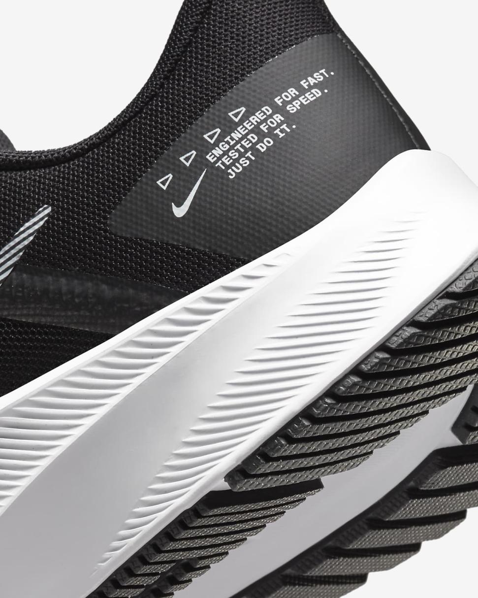 The mesh-lined tongue is connected to the upper's inner lining for a secure feel. An alphanumeric logo at the tongue spells out Nike Quest.